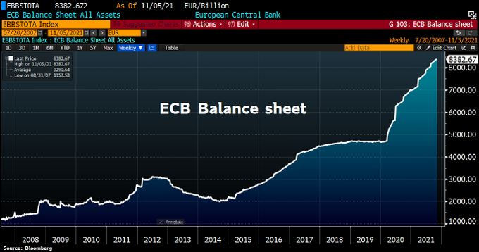 值得一提的是,若按照霍尔兹曼的上述时间表,欧洲央行最终结束当下所有资产购买的时间点,只会比美联储晚几个月。美联储在上周的利率决议中已启动了缩减每月1200亿美元资产购买计划的进程,并预计将于明年年中完全结束QE。