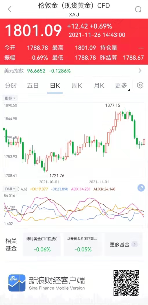 现货黄金站上1800美元/盎司关口,日内涨0.67%。 消息面上,新华社北京11月26日综合新华社驻哈博罗内、伦敦和约翰内斯堡记者报道,博茨瓦纳、南非等多国近日报告了一种新型变异新冠病毒,该毒株不同寻常的变异已引发众多科研人员关注。