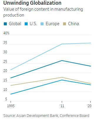 尽管坊间此前普遍认为供应链中断、劳动力短缺和天量的财政及货币刺激,是导致短期通胀上升的主要原因。但如今,越来越多的市场人士也开始注意到了一个之前较少被提及的长期因素:去全球化!