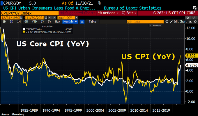 近几个月来,持续高企的通胀数据,已经让原本坚持“通胀暂时论”的美联储不得不打脸般地收回了这一表述。美国劳工部上周五公布的数据显示,美国11月消费价格指数(CPI)较2020年11月同比上涨6.8%,创下近40年来最大增幅,并继续延续了今年早些时候开始的大幅升高趋势。