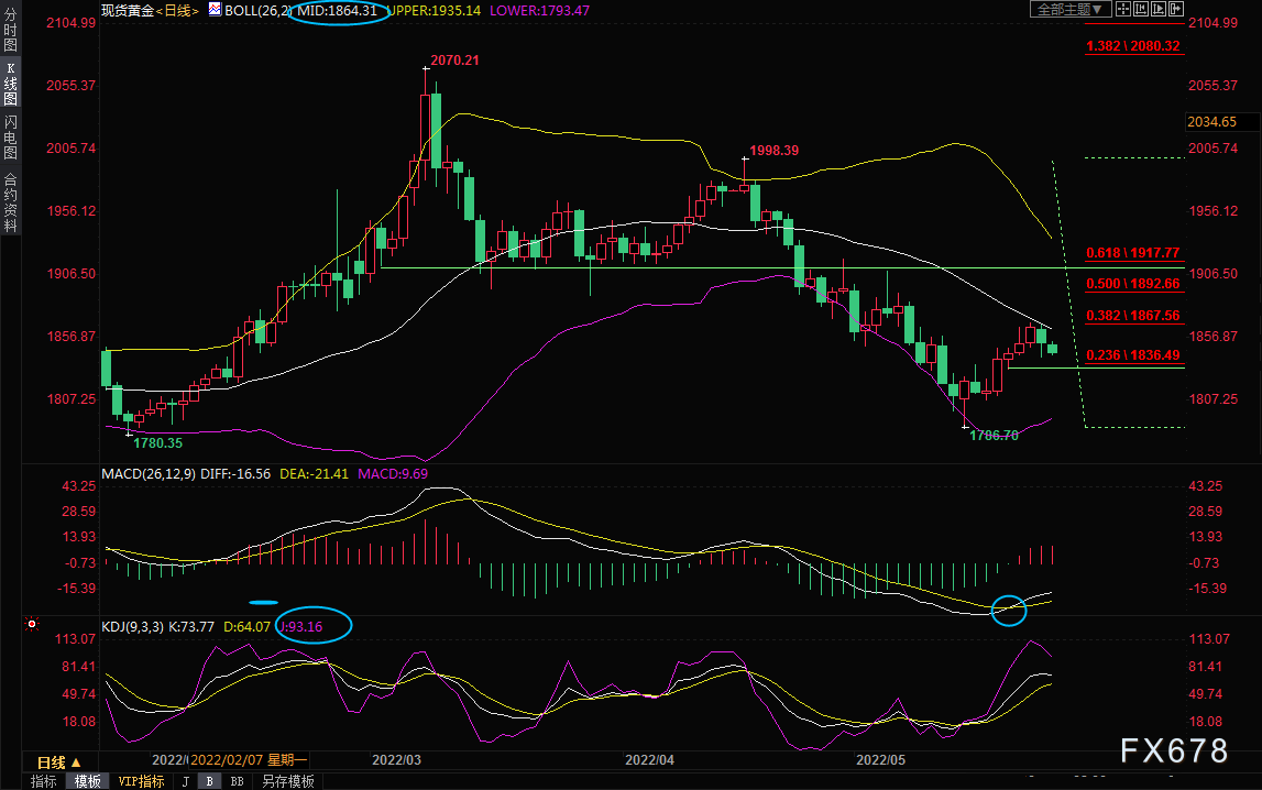 日线级别:震荡下跌后反弹受阻,布林线中轨附近的多重阻力对金价压制明显,KDJ有拐头的趋势,需要提防金价重回跌势的风险,初步支撑在200日均线1840.40附近,10日均线支撑在1837.32附近,5月20日低点支撑在1832.23附近,若跌破该支撑,则增加短线看空信号。