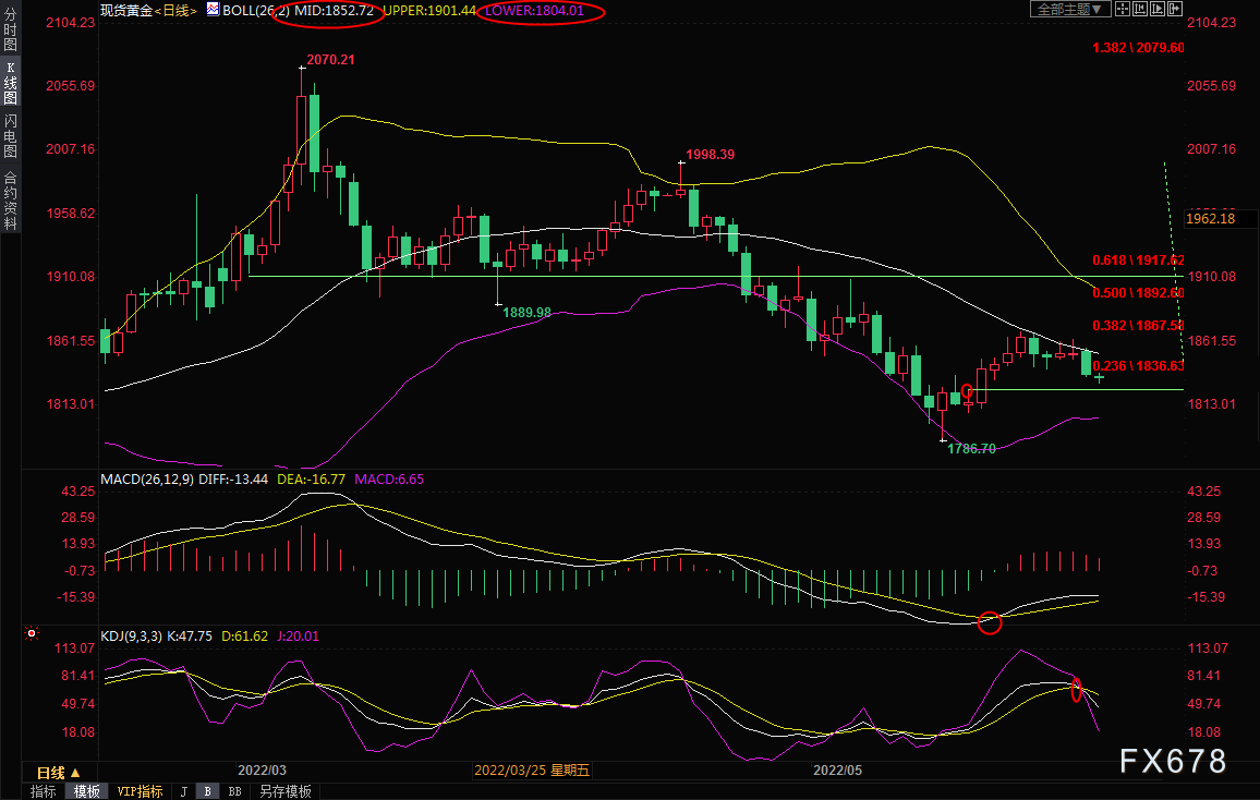 周三(6月1日)亚欧时段,现货黄金震荡微跌,一度创近两周新低至1829.42美元/盎司,一方面,拜登誓言要给美联储主席鲍威尔“空间”,放手让其抗击通胀,给美元和美债收益率提供支撑,打压金价;另一方面,市场对晚间美国ADP就业数据和本周将出炉的非农就业报告预期比较乐观,也令金价承压。技术面短线看空信号有所增加,金价短线仍有可能进一步震荡下探。日线级别:震荡;金价在前期跌势的38.2%回撤位强阻力附近受阻后震荡,布林线中轨对金价的压制也非常明显,目前回落至200日均线1841.40下方,KDI重新结成死叉,短线金价面临重回跌势的风险。初步支撑在5月18日高点1824.62附近,布林线下轨支撑目前在1803.93附近,能否进一步下破还有待观察。