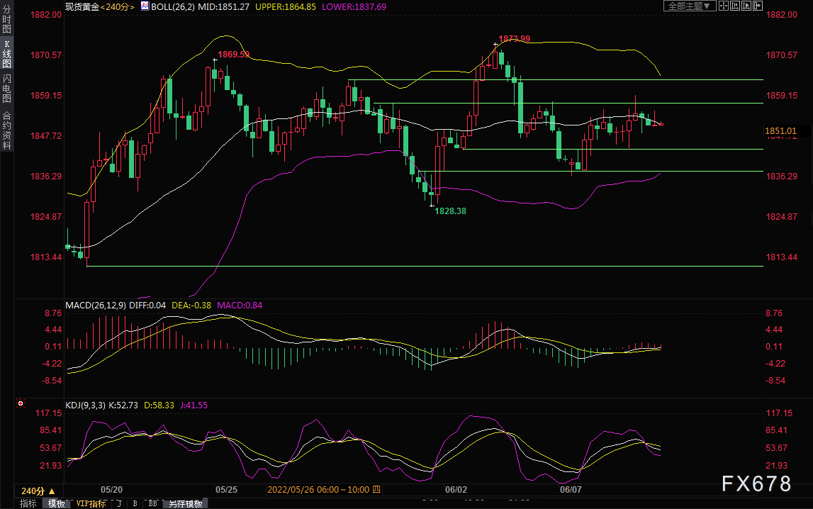 周四(6月9日)亚欧时段,现货黄金窄幅震荡,目前交投于1851.68美元/盎司附近,虽然经合组织下调对全球经济增长的预测,并上调通胀预估,给金价提供支撑,但美元指数相对坚挺,10年期美债收益率回升至3%上方,令持有黄金的机会成本增加,在美国初请失业金人数变动和美国CPI数据出炉前,市场观望情绪较浓。