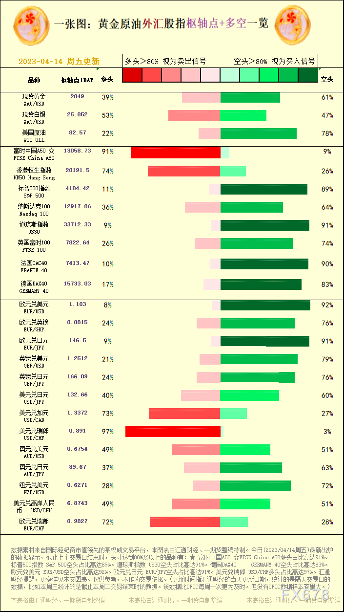 一张图:黄金原油外汇股指"枢纽点+多空占比"一览(2023/04/14周五)|美元