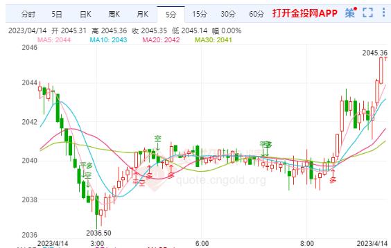 周五(4月14日),本交易日金价上涨0.34%,报2046.51美元,金价强势走高,早盘保持震荡偏强的走势,美盘时段直线拉升至2040美元上方,随后维持在高位水平运行至收盘,美元指数持续走弱,并且一度跌破101点,从目前的一个走势都能够看出市场的一个投资情绪依然是有所好转,也能够显示出目前对于美联储尽快的去结束加息,甚至还是有一些投资者比较乐观的,可能会去预期美联储会尽早的在年内就进行降息,那这样的一些预期出现之后对于黄金的上涨空间是有一个比较大的帮助。