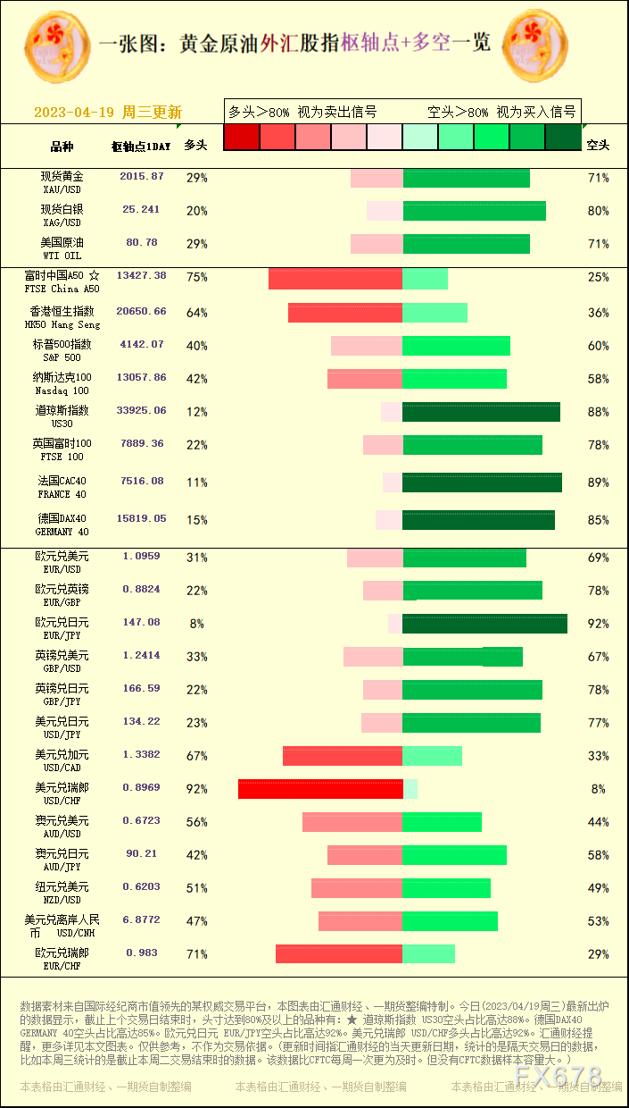一张图:黄金原油外汇股指"枢纽点+多空占比"一览(2023/04/19周三)|美元