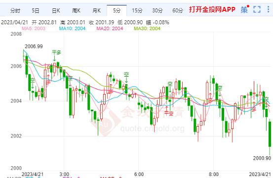 周五(4月21日)本交易日现货黄金继续维持跌势,今日开盘报2003.91美元/盎司,最高触及2005.50美元/盎司,最低触及2000.39美元/盎司,截止发稿金价报2002.79美元/盎司,跌幅0.08%