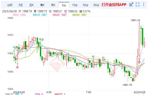 周五(4月28日)本交易日国际金价今日开盘报1986.69美元/盎司,最高触及1991.56美元/盎司,最低触及1984.78美元/盎司,截止发稿金价报1989.35美元/盎司,涨幅0.09%。