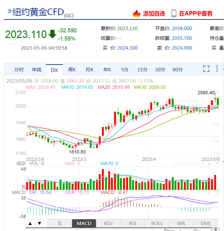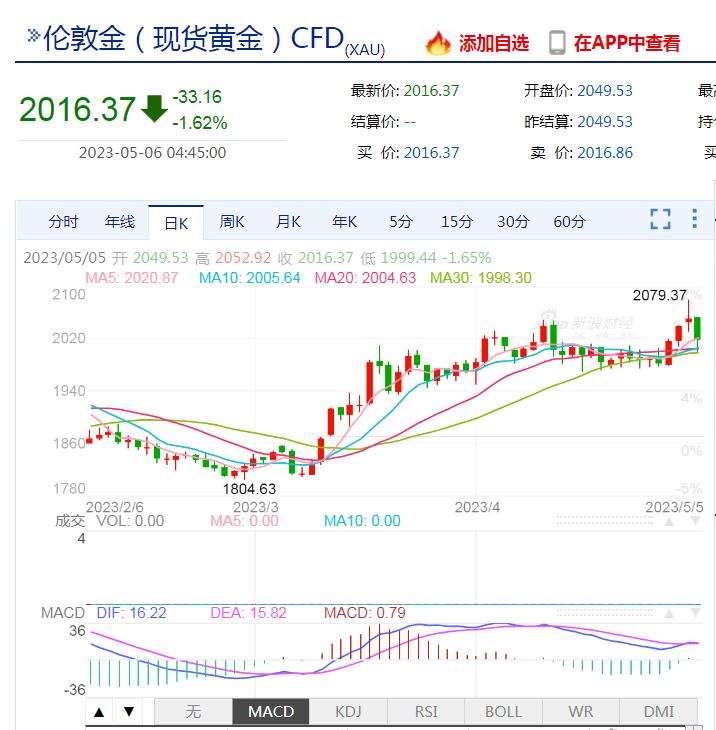 截至当地时间5月5日收盘,伦敦金收报2016.37美元/盎司,跌幅1.62%,纽约黄金CFD报2023.11美元/盎司。