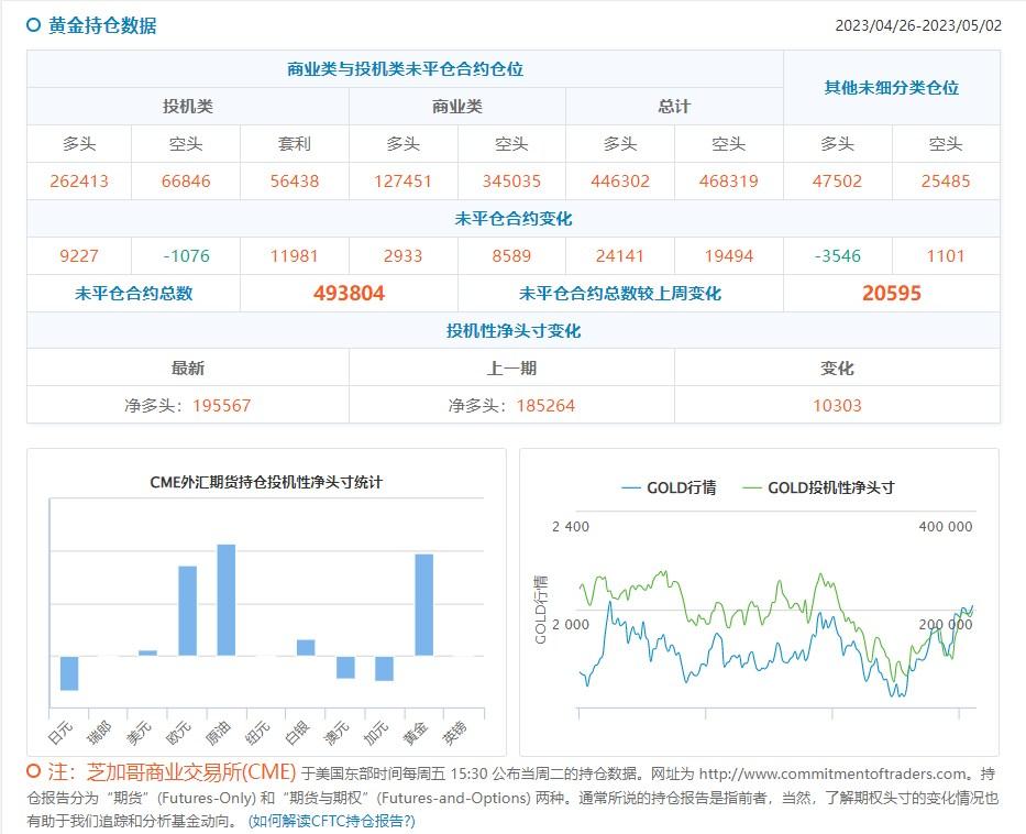 汇通财经APP讯——汇通财经据CFTC官网持仓数据:Comex黄金投机者在截至5月2日的一周内将净多头头寸增加14642手,至147816手;截至5月2日当周,WTI原油期货投机性净多头头寸减少37222手至143220手。