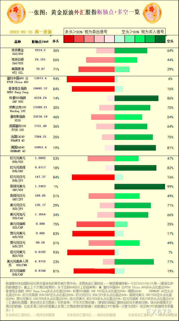 一张图:2023/05/15黄金原油外汇股指"枢纽点+多空占比"一览|美元