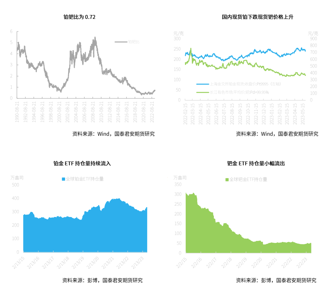 资料来源:Wind,国泰君安期货研究在期货持仓变动方面,截至5月23日,铂金总持仓较上一周减少331张,其中非商业多头方面增加1284张,非商业空头持仓持续减少,较上一周减少372张,降幅达2.63%。因此,非商业净多头持仓增加1656张,出现增长,涨幅达6.4%;在净持仓多空前8名占比上,铂金方面净持仓多头占比减少2.8%,空头占比增加0.8%。钯金方面,截至5月23日,总持仓减少1623张,其中非商业多头持仓减少62张,空头增加311张,因而非商业净多持仓增长373张,降幅达7.58%。在净持仓多空前8名占比上,钯金方面多头增加5.6%,空头占比增加6.7%。