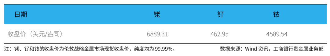 伦敦现货铑(99.99%)收盘价为6889.31美元/盎司,周累计下跌1.43%。