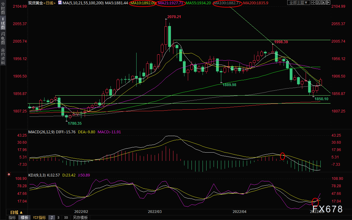 日线级别:震荡下跌后反弹;金价在1850附近获得支撑后反弹,KDJ低位金叉形成,K线在低位录得类似“启明星”的底部信号,短线偏向多头,初步阻力在4月29日高点1919.81附近,关键阻力在21日均线1927.70附近,若能收复该位置,则增加中线看涨信号。