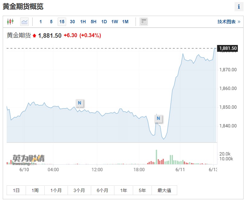 COMEX 8月黄金期货在上周五收于1875.50美元/盎司,为5月5日以来最高收盘水平。截至发稿,COMEX 8月黄金期货涨0.34%,报1881.50美元/盎司。