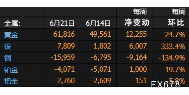 美国商品期货交易委员会(CFTC)数据显示,截至6月21日当周,对冲基金COMEX黄金期货净多头头寸增加12256手至61816手;其中,多头寸在截至6月7日的一周中增加3704手至125213手合约,空头寸减少8551手至63397手合约。