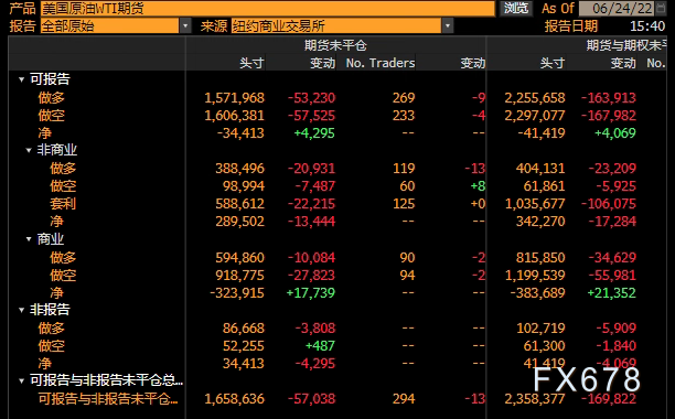 美国商品期货交易委员会(CFTC)数据显示,截至6月21日当周,纽约商品交易所WTI原油净多头头寸减少31972手合约至234012手合约;其中多头寸仓位下降28777手至261295手合约,为近两年多最低记录,空头寸增加3195手至27283手,为近两个月新高。