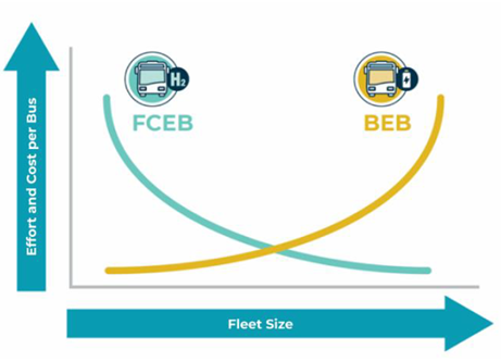燃料电池技术是电池电气化的一种替代方式,它特别适合应用于重型车,提供更长的续航里程,更短的补给时间,更高的容量利用率和更轻的车重。虽然目前给纯电动汽车充电不太可能对主电网造成过重的负担,但它需要电网在电动车大规模普及的某个阈值下进行重大升级。这对于在固定路线下运行的重型车辆来说尤其如此,因为众多车辆夜间充电或按需充电时可能要求重大的电网升级,尤其在车队规模扩大后。另一方面,安装加氢设施的单辆车成本会随着车队规模的扩大而下降,因为更短的加氢时间意味着该设施可以为更多车辆提供服务,如下面的巴士运营商示意图所示。
