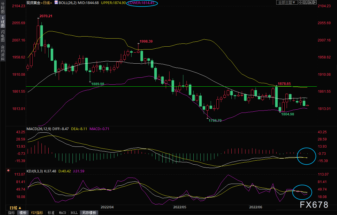 整体来看,黄金正受到美联储和全球多数央行激进收紧货币政策的压力,美股反弹、美元上涨也是一个障碍,短线金价仍偏向震荡下行,短线留意日线级别布林线下轨1815附近支撑,重点关注1800整数关口附近支撑。但欧美国家经济数据表现不佳,市场对经济衰退的担忧也可能会限制金价的短线下行空间,甚至会提供探底回升的机会,投资者也需要予以警惕。