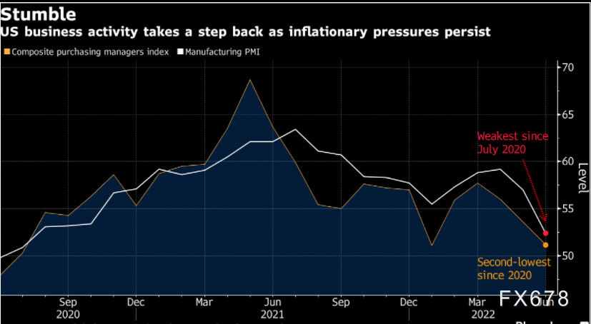 S&P Global周四发布的6月份美国综合产出指数初值下滑2.4点至51.2。虽然仍高于50,但这已是2020年7月以来的次低水平,当时经济正在竭力摆脱疫情引发的衰退。