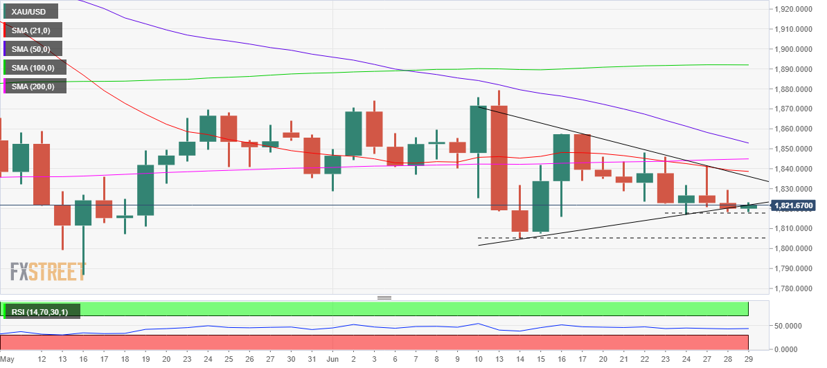 24K99讯 周三(6月29日)欧市早盘,现货黄金维持跌势,目前金价位于1817美元/盎司附近。知名财经网站FXStreet分析师Dhwani Mehta周三最新撰文,对金价技术前景进行分析。