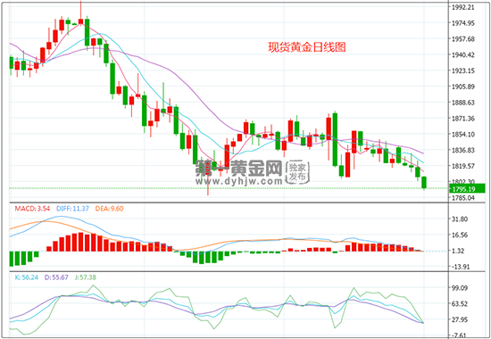 从日线图上看,震荡下跌;MACD死叉,KDJ死叉,均线初步空头排列,需要提防金价进一步破位下跌风险,下方关键支撑在1800附近,布林线下轨支撑也在该位置附近,若失守该支撑,则可能会进一步试探5月16日低点1786.70附近支撑;然后1月28日低点支撑在1780.35附近支撑,甚至还会跌至更低。