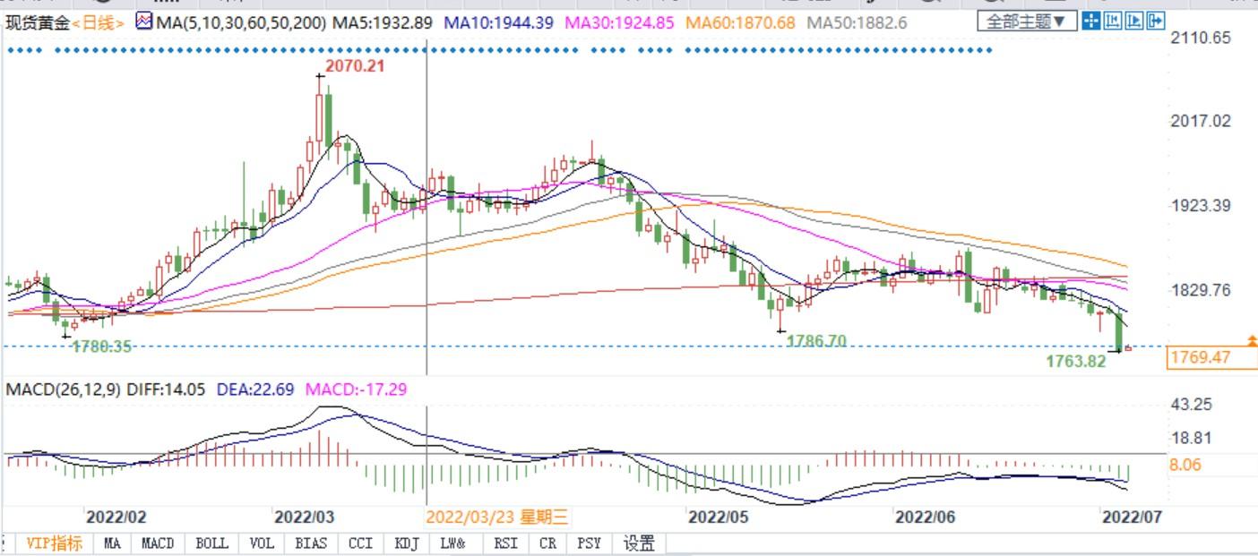 (现货黄金日线图)北京时间7月6日8:19,现货黄金报1769.51美元/盎司。