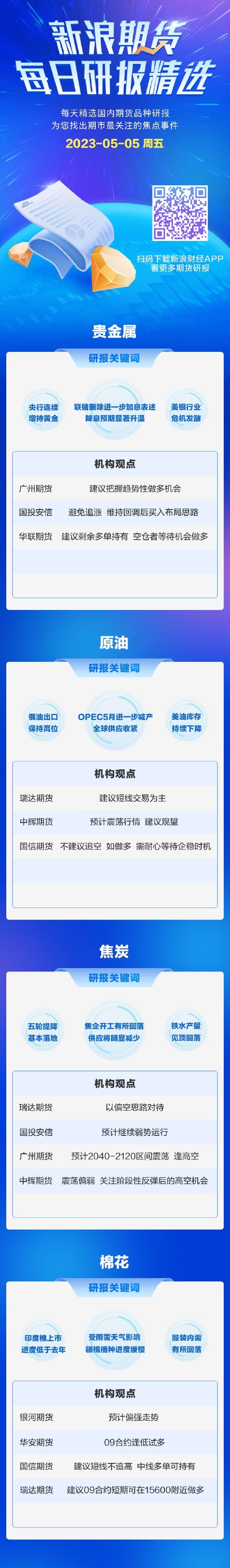 新浪期货今日期货研报精选(2023.05.05)|原油 来源:正大期货 作者:正大国际期货 时间:2023-05-05 今日期货研报精选:贵金属、原油、焦炭、棉花 新浪合作大平台期货开户 安全快捷有保障