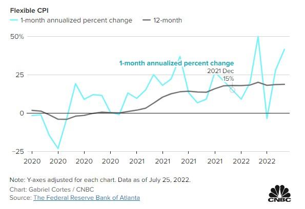 单月年化粘性CPI——个人护理产品、酒精饮料和汽车保养——6月单月年化为8.1%,或12个月年化为5.6%。美联储的弹性CPI(包括汽车价格、汽油和珠宝等)年化增长了惊人的41.5%,同比增长了18.7%。