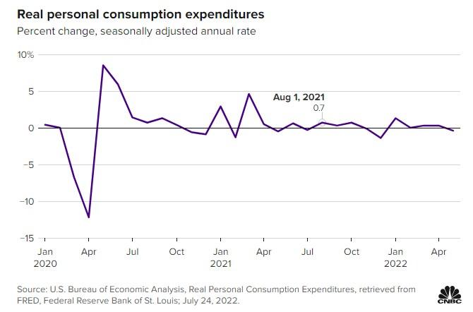 7月25日,市场分析师Jeff Cox撰文称,美国能否避开衰退主要取决于消费者。今年第一季度,消费者占美国经济活动总量的68%。然而,最近的迹象显示,4月至6月期间的支出有所下降。实际个人消费支出PCE(扣除通胀因素)在第一季度仅增长0.2%后,5月份下降了0.1%。事实上,今年前5个月,实际支出有3个月出现下降,这是40多年来通胀率最高的结果。
