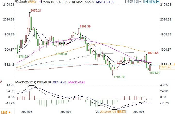 现货黄金日线图北京时间6月16日15:18 现货黄金 报 1831.96美元/盎司