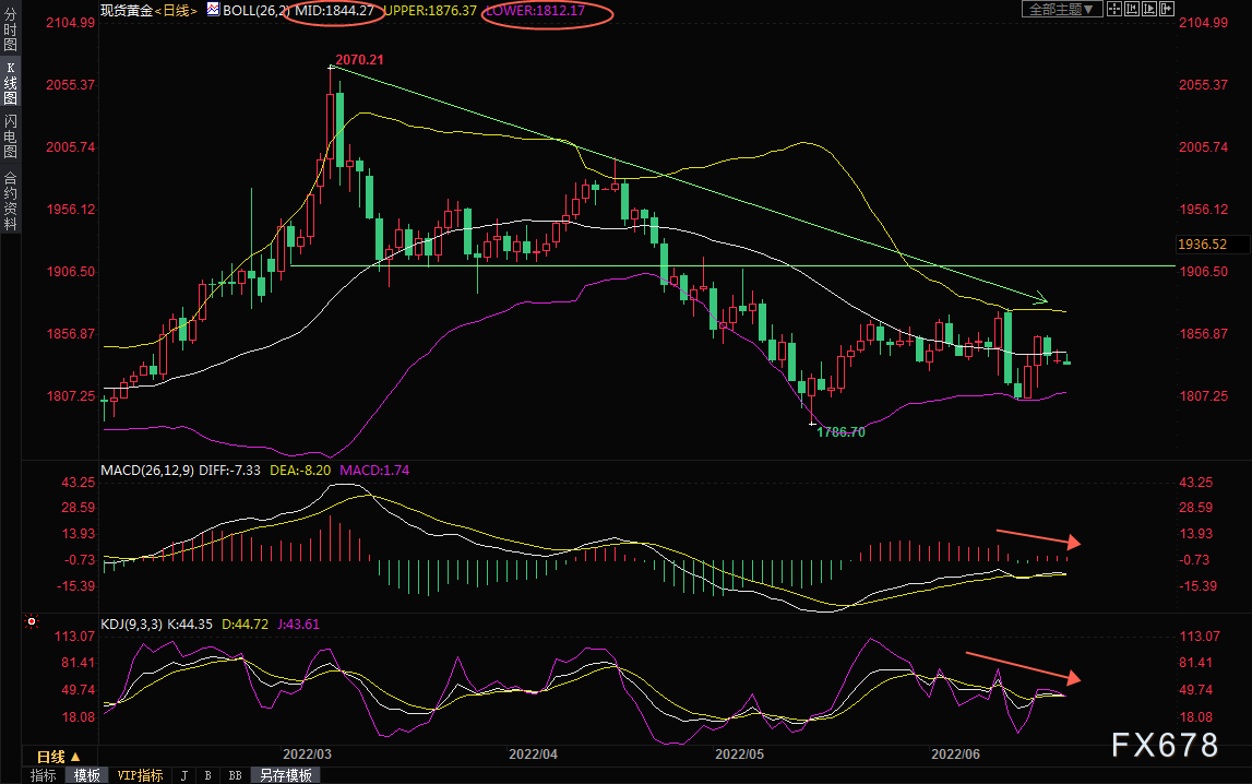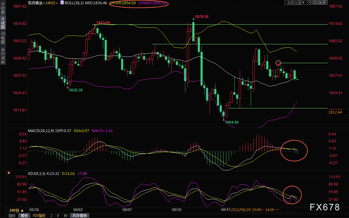 上方初步阻力在布林线中轨1844.26附近,然后是1850整数关口附近阻力,若金价顶破该阻力,则削弱后市看空信号。进一步阻力在6月16日高点1857.93附近。