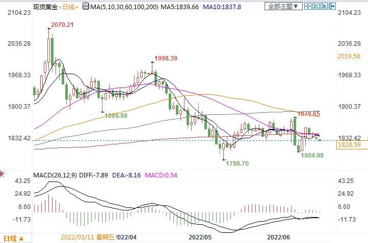 现货黄金日线图北京时间6月22日10:00 现货黄金 报 1828.59美元/盎司