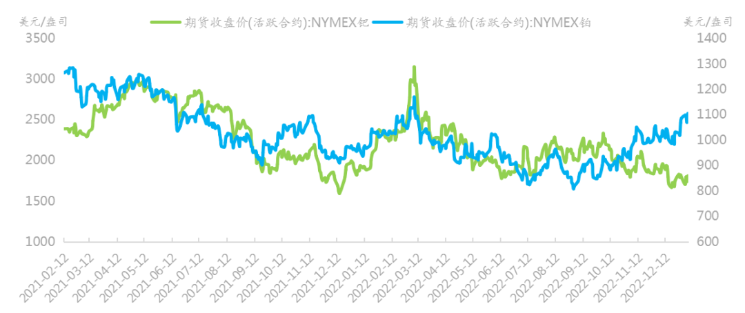 市场预计美联储将缩小1月份加息幅度,美债收益率下跌,美元指数降至半年低位。美联储后续加息缓和的预期不断升温,贵金属上行趋势延续。从矿山生产看,南非电力供应紧张,矿业生产不稳定;俄罗斯镍产量预期下降,作为伴生品的铂族金属将受到影响。供应端形势紧张,给铂族金属价格形成一定支撑。预计近期国际铂价范围为1050-1160美元/盎司,钯价范围为1700-2000美元/盎司。预计国内铂价范围为240-270元/克,钯价范围为430-500元/克。