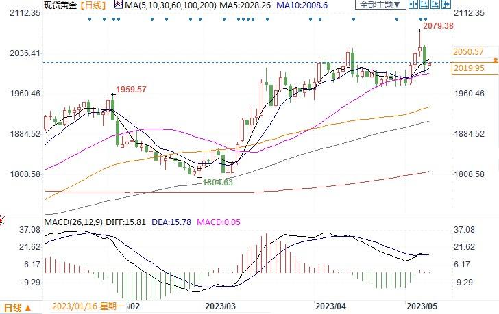 现货黄金日线图北京时间5月8日11:39,现货黄金报2020.14美元/盎司