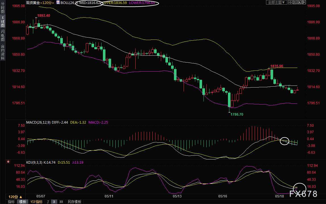 2小时级别:低位震荡;目前MACD死叉,KDJ却有金叉趋势,短线走势缺乏明确方向,布林线轨道水平运行,留意布林线轨道1796.65-1836.59区域突破情况。