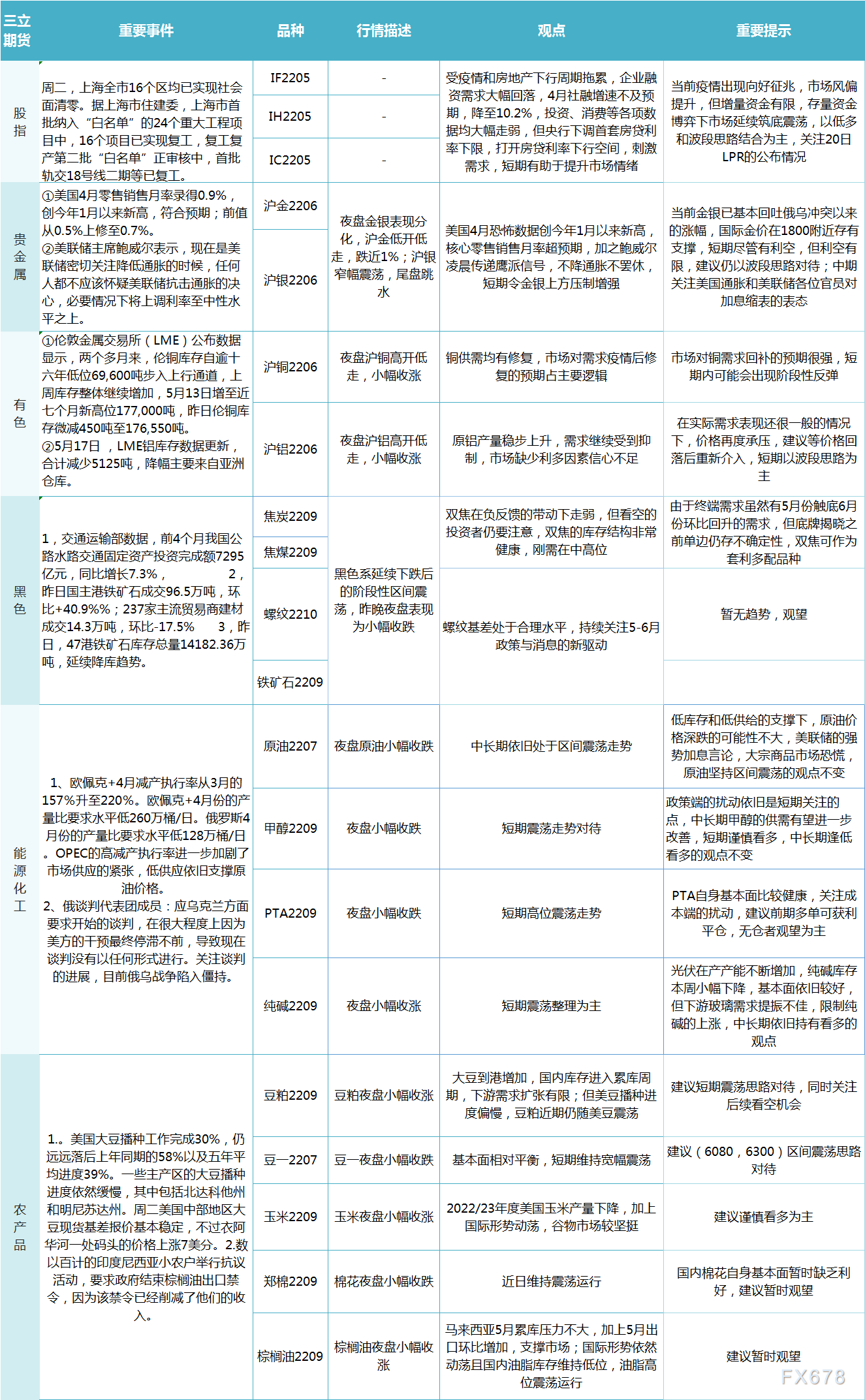 三立期货5月18日早评:一张图尽览股指、贵金属、能源化工、农产品、有色和黑色系预测|期货 来源:正大期货 作者:正大国际期货 时间:2022-05-18 三立期货5月18日早评:一张图尽览股指、贵金属、能源化工、农产品、有色和黑色系预测。