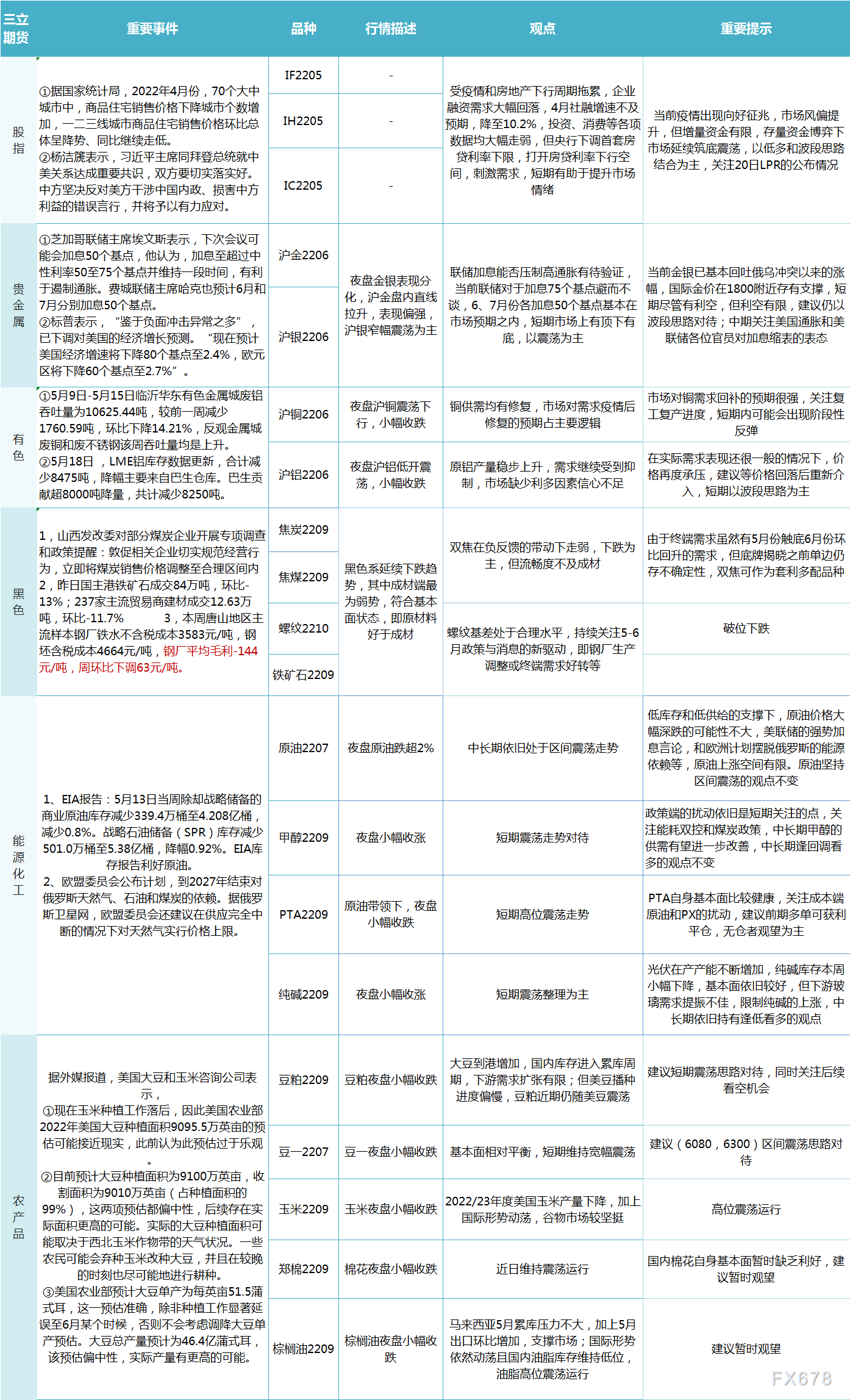 三立期货5月19日早评:一张图尽览股指、贵金属、能源化工、农产品、有色和黑色系预测|期货 来源:正大期货 作者:正大国际期货 时间:2022-05-19 三立期货5月19日早评:一张图尽览股指、贵金属、能源化工、农产品、有色和黑色系预测。