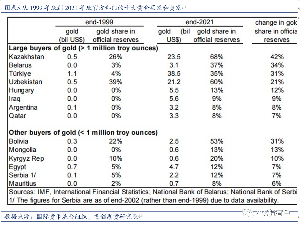 自1999年以来,官方黄金持有量增加了7%,这是由EMDEs持有的黄金吨数增加了130%推动的。最大的买家是俄罗斯、中国、土耳其和印度,而最大的卖家是瑞士、法国、荷兰和联合王国(图5)。在某些情况下(如葡萄牙),尽管出售了黄金,但黄金在储备资产中的份额增加了,这或者是因为总储备的变化,或者是因为黄金的市场价格在过去20年中增长了6倍(图5,最后一栏)。