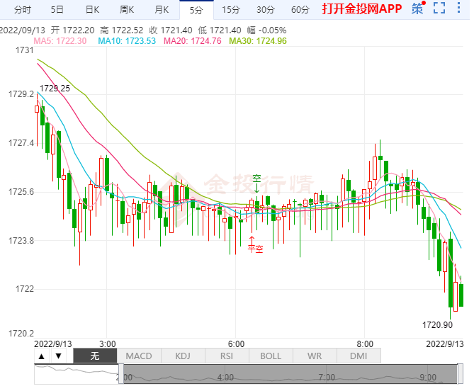 周二(9月13日),现货黄金本交易日盘内维持震荡走势,截止发稿,黄金价格最高触及1727美元/盎司,最低价1719美元/盎司。