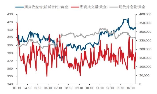 图2:外盘黄金期货量价关系(美元/盎司,手)