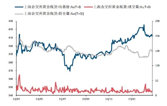 图5:内盘黄金现货量价关系(元/千克,吨)