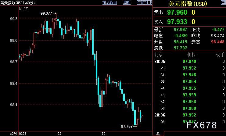 北京时间20:02,现货黄金上浮0.19%至1922.96美元/盎司;COMEX期金主力合约上涨0.49%至1927.4美元/盎司;美元指数下跌0.52%至97.917;欧元兑美元上涨0.49至1.1138。