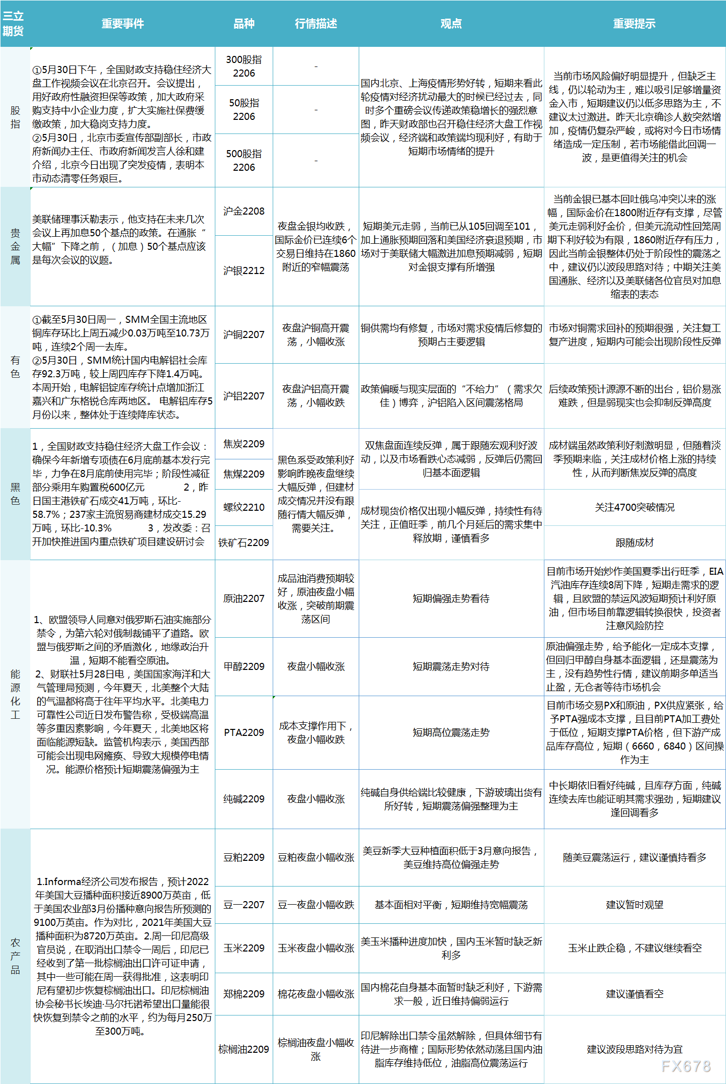 三立期货5月31日早评:一张图尽览股指、贵金属、能源化工、农产品、有色和黑色系预测|期货 来源:正大期货 作者:正大国际期货 时间:2022-05-31 三立期货5月31日早评:一张图尽览股指、贵金属、能源化工、农产品、有色和黑色系预测。