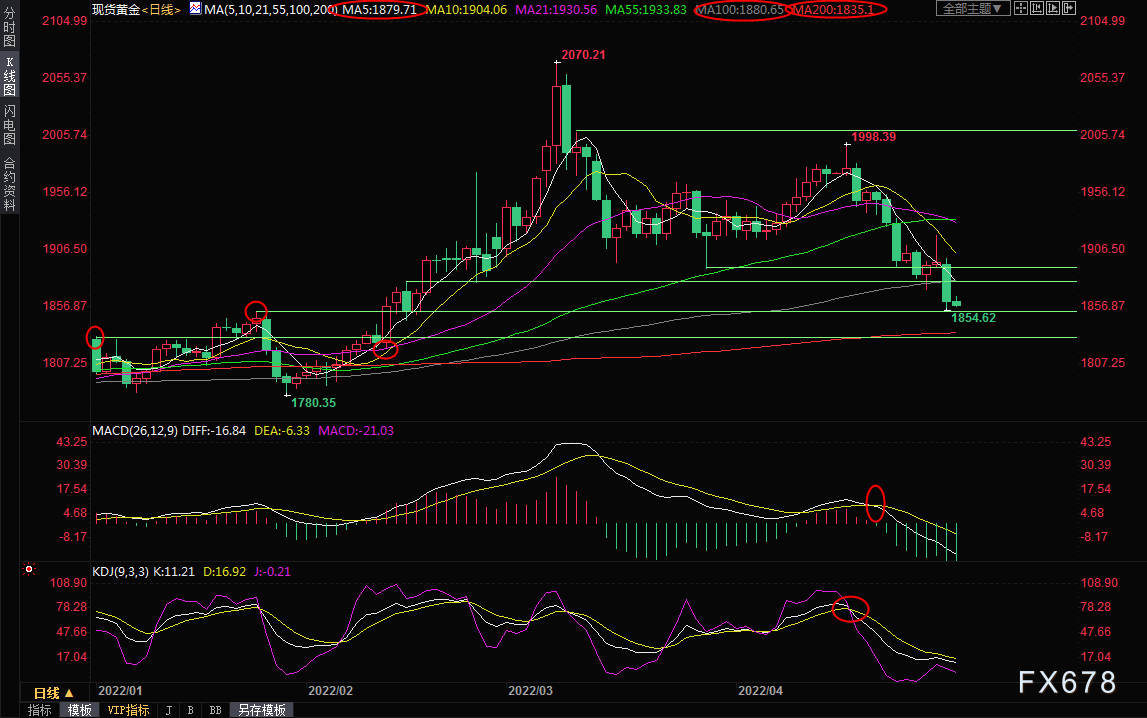 周二(5月3日)亚欧时段,现货黄金维持弱势,目前回落至1860下方,交投于1858.36美元/盎司。美联储的大幅加息和缩表预期支撑美元和美债收益率,而且全球多个央行都将逐步加息,澳洲联储加息力度强于市场普遍预期,在本周美联储利率决议前,仍可能会对金价形成压制,金价短线存在进一步试探200日均线1835附近支撑的可能性。