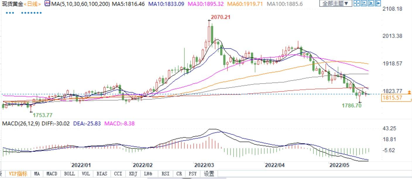 现货黄金日线图北京时间5月19日10:12,现货黄金报1815.65美元/盎司。