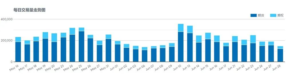 从交易量来看,COMEX黄金期权进入6月以来总成交量494323张,环比增加6640张;最新持仓量785128张,环比增加225853张,增幅40.4%,COMEX黄金期货及期权成交量环比均有所增加,总体来看,目前COMEX黄金期权交易活跃度维持在较高水平。