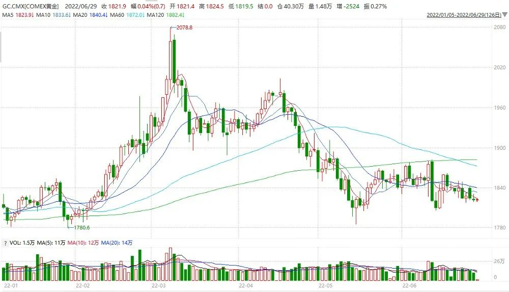 周四(6月30日)亚市盘初,COMEX黄金交投于1820附近,因激进加息带来的阻力以及经济衰退风险加剧推动的避险买盘影响,黄金走势胶着;美元交投于105.10附近,美联储主席鲍威尔表示,美国经济的最大风险是持久的高通胀,而不是加息会使经济增长速度大幅放缓。美国股市标普500指数周三收盘小跌,盘中在平盘上下游走,投资者即将跌跌撞撞地走完一个令人沮丧的月份、一个低迷的季度以及自尼克松总统第一个任期以来华尔街指标股指表现最差的上半年。美国经济第一季度萎缩程度略高于之前的估值,因贸易赤字扩大至创纪录高位,以及新一波新冠疫情抑制了娱乐等服务支出。之前的消费者信心报告显示,消费者预期降至2013年3月以来的最低水平。