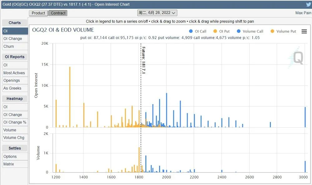 数据来源:芝商所 QuikStrike,数据截至2022年6月28日图表4:COMEX黄金期权合约持仓分布