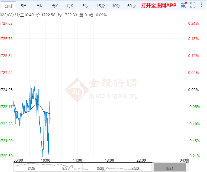 本交易日,现货黄金维持小幅震荡走势,截至发稿仍坚守1720美元上方,后市聚焦关注美联储非农数据及加息预期。